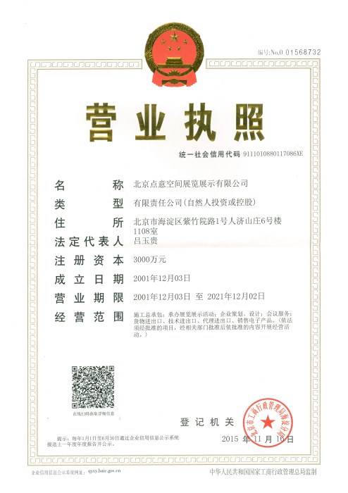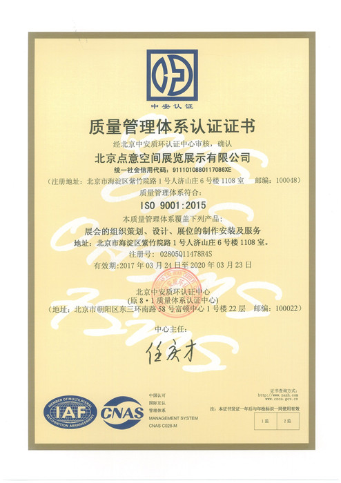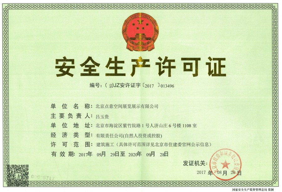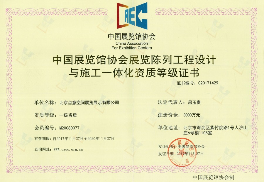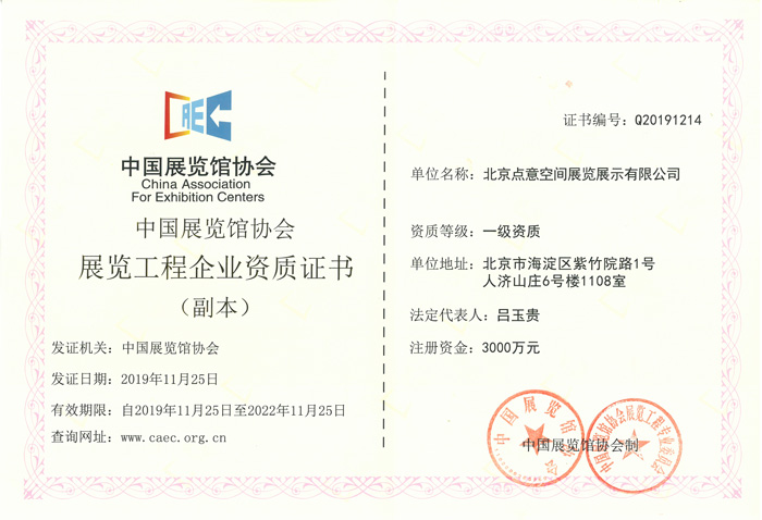點(diǎn)意空間中國展覽館協(xié)會展覽工程企業(yè)資質(zhì)證書一級資質(zhì)