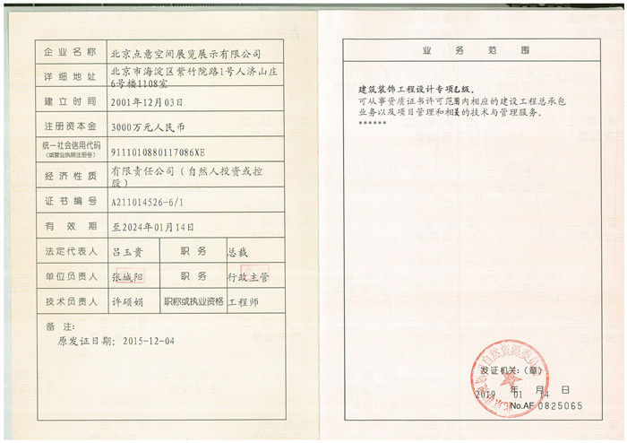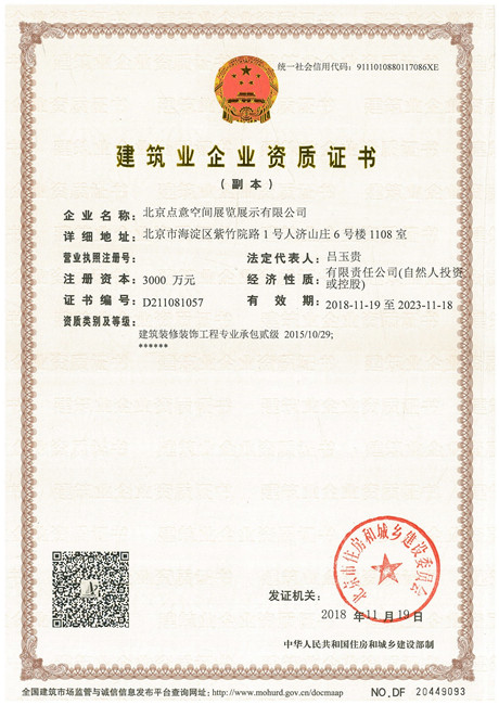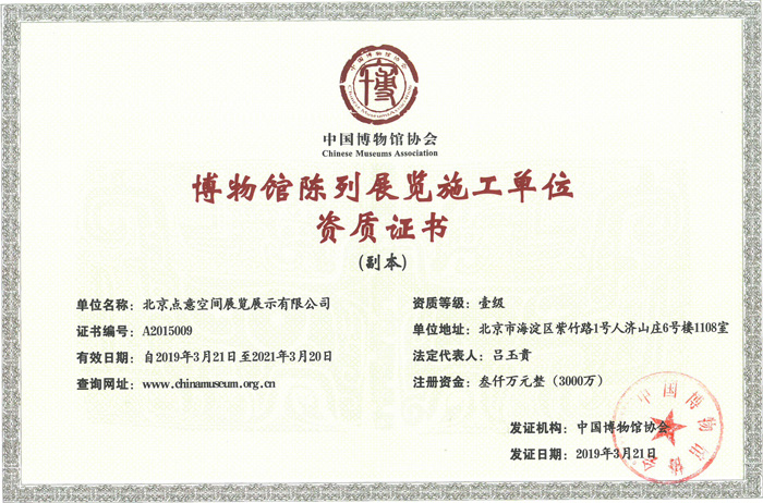點(diǎn)意空間博物館陳列展覽施工單位資質(zhì)證書壹級