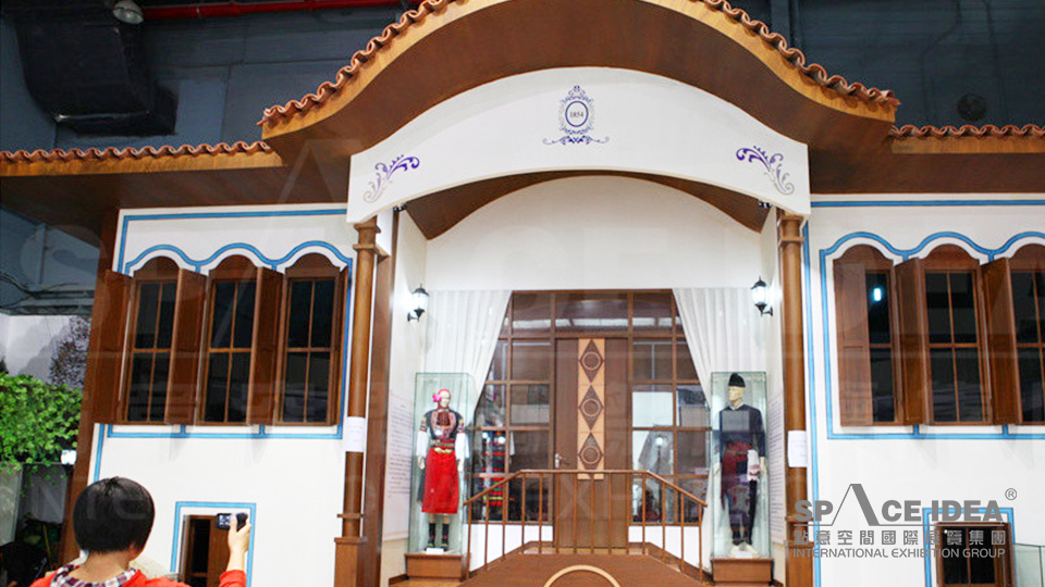 廣場展區一角仿照保加利亞一座著名的博物館,墻上的壁畫和木雕天花板精美絕倫,軛、弓形窗、寬大屋檐和封閉陽臺具有獨特的建筑特點。