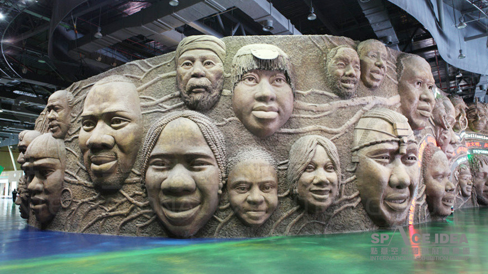 走進非洲聯合館,一面巨大的人臉雕像群“非洲的微笑”映現眼前。她的靈感來自于埃塞俄比亞發現的320萬年前古人類遺存的化石。人類共同的母親“露西,通過多媒體的形式,從遠古時代猿人的臉逐步過渡到現代人的微笑,給人以強烈的視覺沖擊力,非常動人,感人,增添了濃郁的人文氣息。環顧四周,海洋般深邃的藍、原始森林里廣袤的綠和太陽直射下沙漠的燦黃,三色顏料繪成的地板頃刻間帶領游客返回古老的人類誕生地非洲。