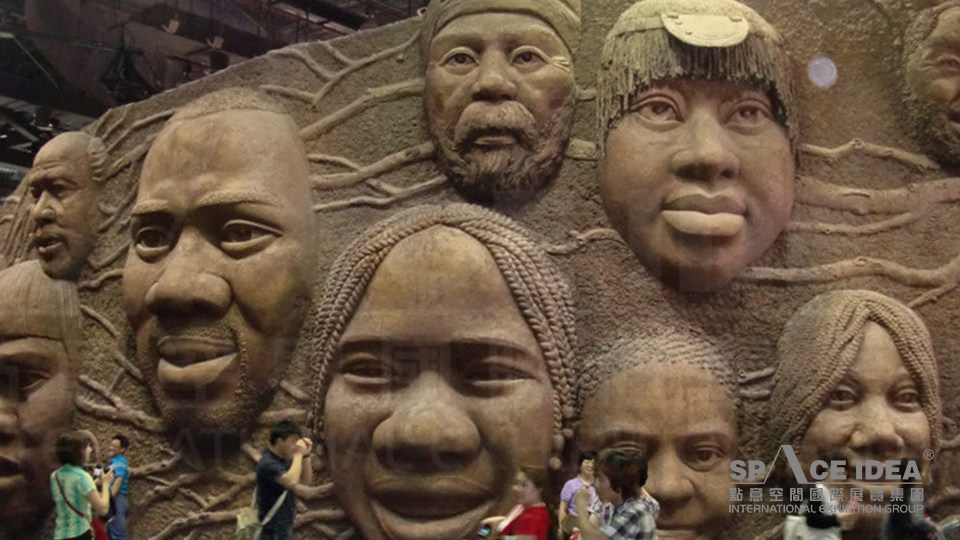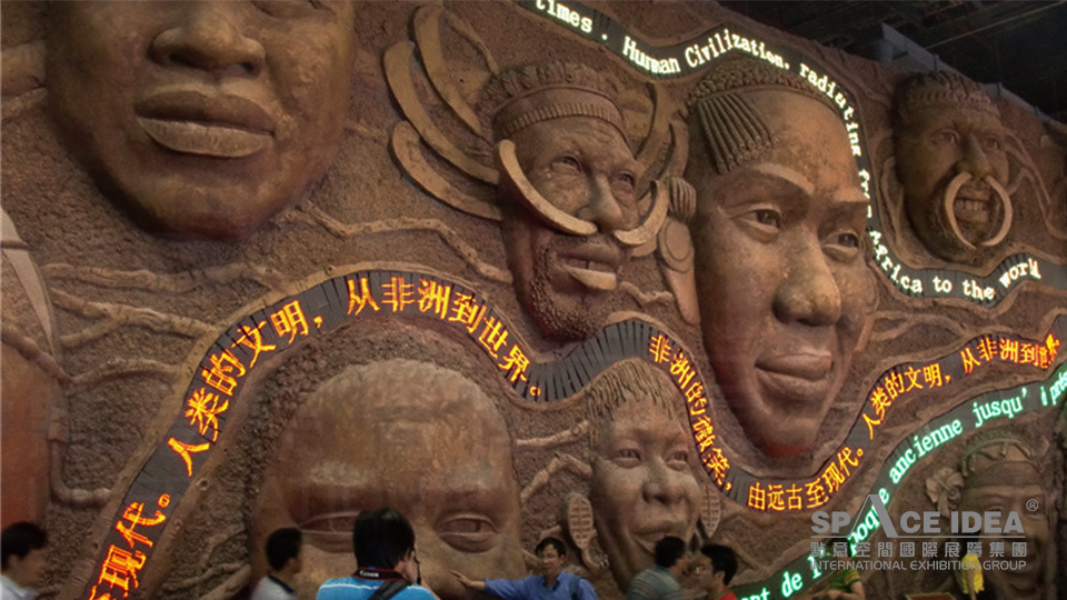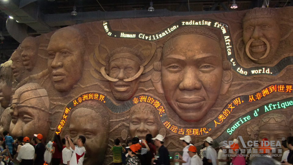 非洲聯合館主題定位是人類文明的起源地。圍繞此主題,點意空間深度挖掘、充分運用富有強烈非洲特征的元素,營造非洲聯合館平實而溫馨的氛圍,完美詮釋古老而充滿生機的非洲大陸。以濃郁跳躍的色彩,呈現各國獨到的理念和獨特的展品,演繹多樣的非洲主題和深厚的文化底蘊,展示豐富多彩、魅力四射、和諧共處的整體非洲形象。融視覺、味覺、觸覺、聽覺、動感于一體,向全世界人民展示一個真實本色的非洲,讓更多的人了解、熱愛非洲,讓參觀者全方位地互動感受,在短時間內領略美麗神奇的非洲風采。