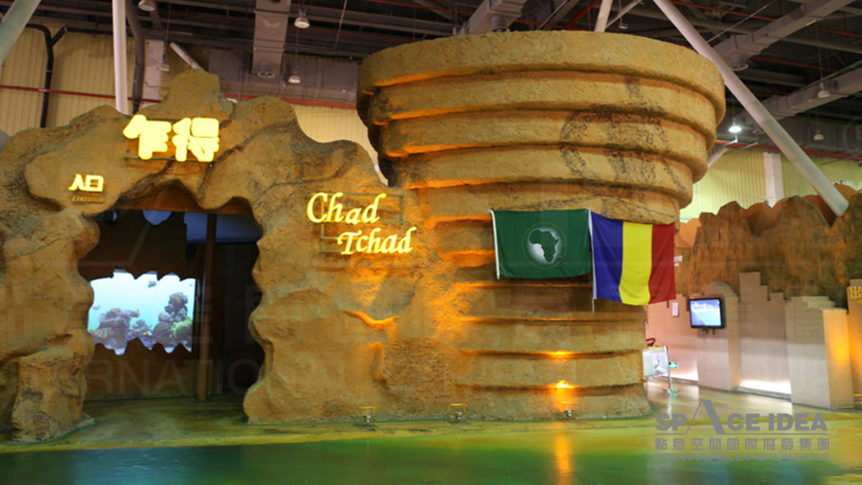 序廳:序廳外景造型凸顯乍得雅丹地貌的特點,并設序幕墻放映電影,展現乍得瑰麗獨特的自然景色和淳樸熱情的民族風情。