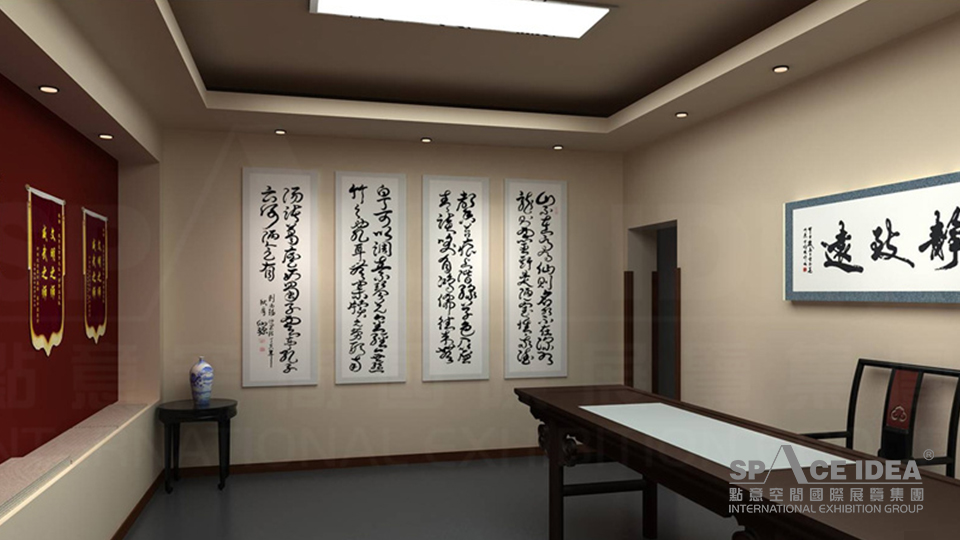 二團軍墾先輩用汗水換來的榮譽,設計時布局風格厚重、古樸,用背柜陳列的形式直觀、簡潔一目了然。臺桌上擺放了筆墨紙硯,方便領導留下墨寶。