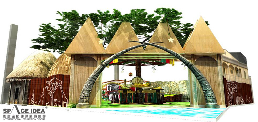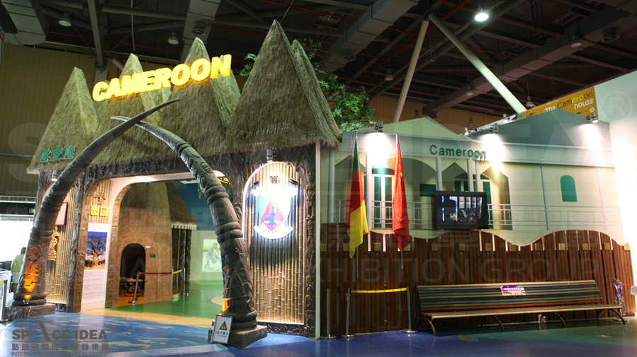 The theme of Cameroon Pavilion is the reshaping of urban communities, with big tree as the core design, open space is given priority to color with green, yellow and blue, which show the natural, optimistic, rich dynamic national amorous feelings of Cameroon. The exhibition area simulates various natural environments as Cameroon plateau, beach and rain forest, and at the same time shows the new appearance of urban residential architecture development in Cameroon. The community's leafy trees in the city cover the entire pavilion, reflecting Cameroon's emphasis on forests and effective conservation. The simulated soccer field in the stadium creates a dynamic atmosphere with sound and lighting, making people fully feel the pleasant life and sports passion of the Cameroon city, as well as the love of the people for football.
