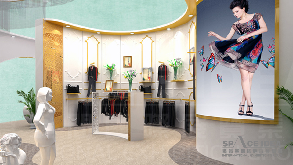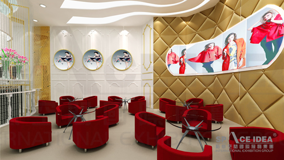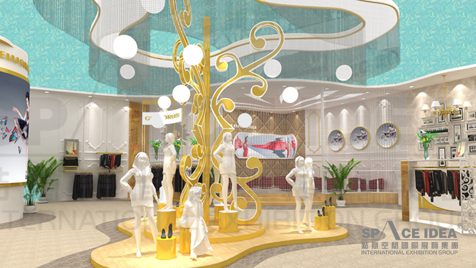 ? 中心展區做為最吸引眼球的設計,它的頂部與底部都采用同樣的歐式異形造型。底部呈階梯提升樣式,使展臺凸顯出來,同時錯落有致的小型展臺便于展示產品。中心立柱作為整個展廳的中心支點,用歐式花藤修飾,既象征著女人的花季,又成為最吸引目光的裝飾,同時又為中心展臺進行了分隔,是空間感增強,錯落有致球形燈凸顯了夢幻的感覺。而與地面遙相對應的發光異型歐式天花配以金屬簾,使燈光經過金屬簾后,變得細碎朦朧閃耀如星光。