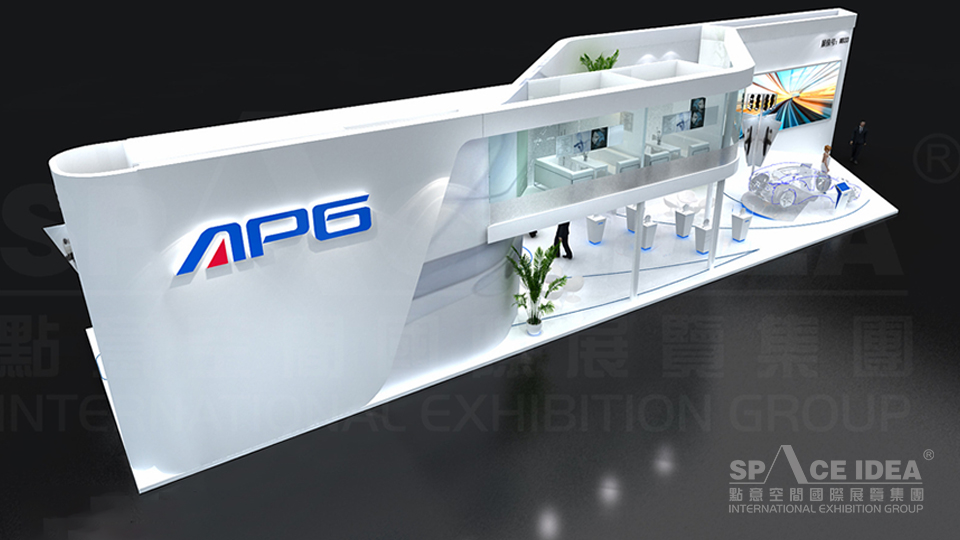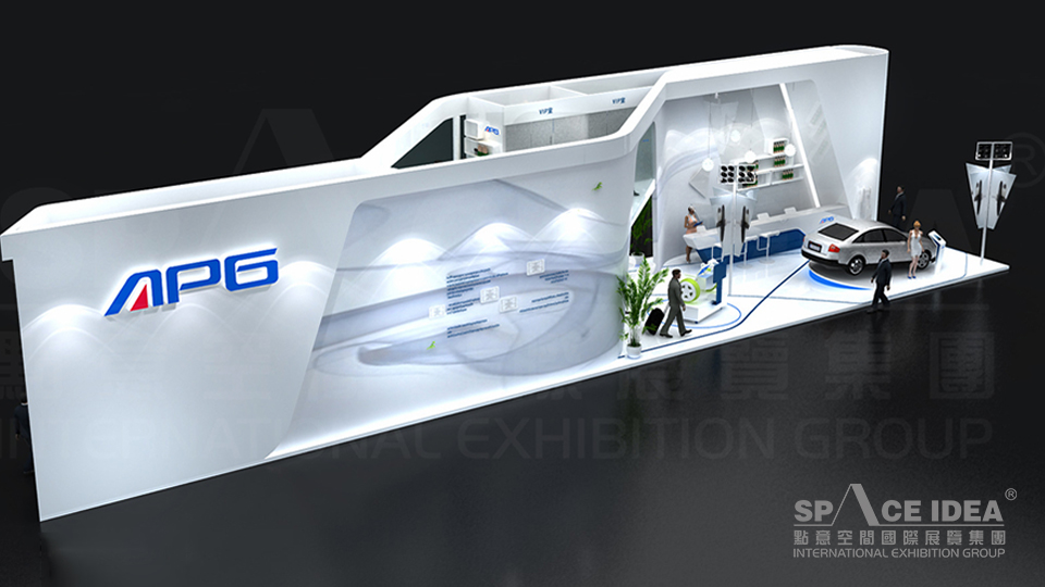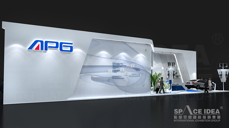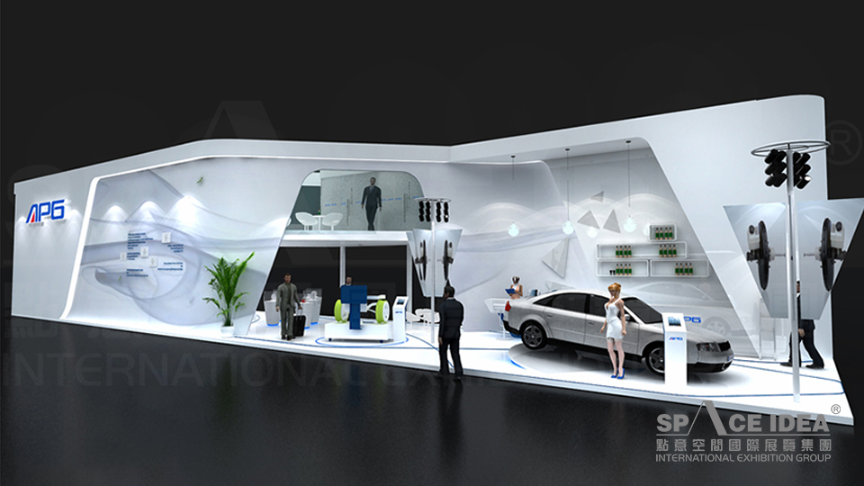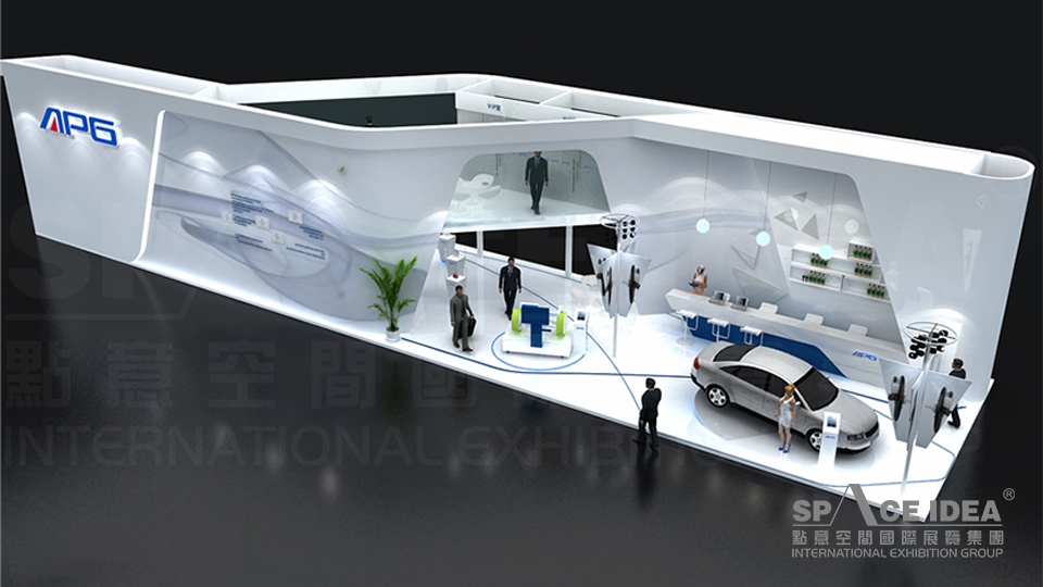 本案設計是一個現代酷炫風格的汽車展臺,全空間以現代工業建筑材料為基礎,內部功能合理明確,立面通透美具有很強的現代感,構成時尚、大氣的空間主調。入口處的觸摸式裝置,可以增加觀眾游客體驗的興致;展臺墻壁上的等離子顯示器,播放亞太機電的宣傳片,展示亞太各種車型的絕佳性能;展位上方是專業汽車展示燈和低溫高亮度白光燈,可以將觀眾的視線聚焦到車身上。
