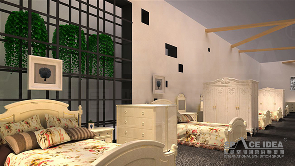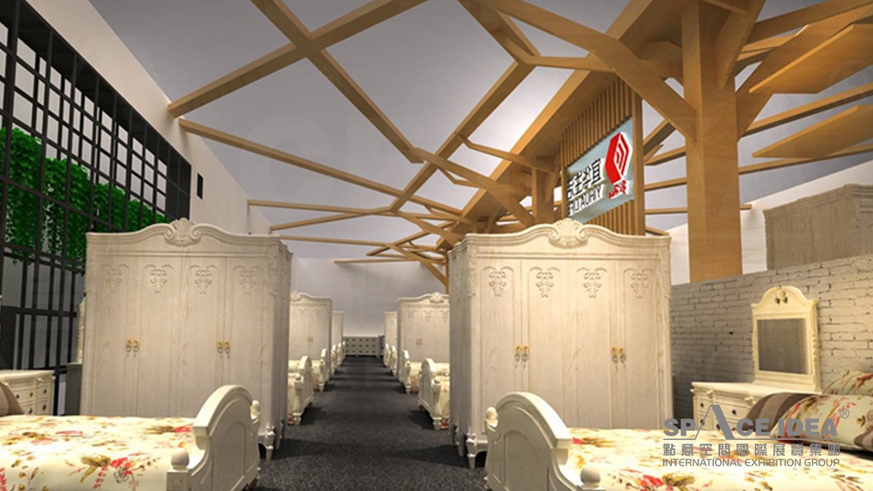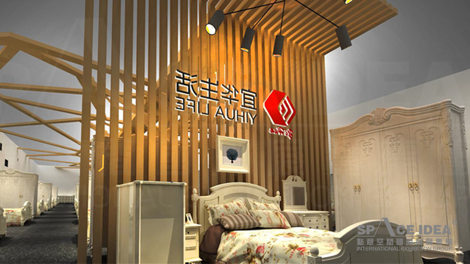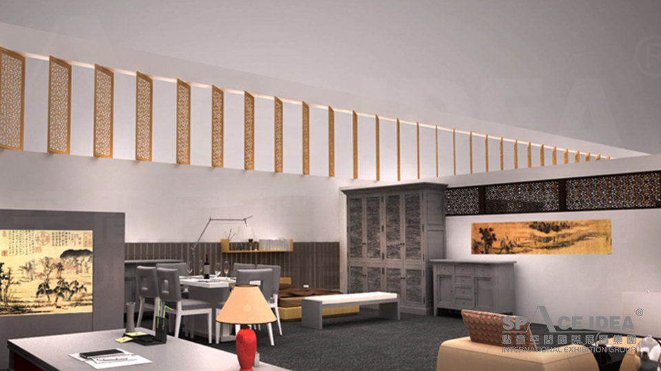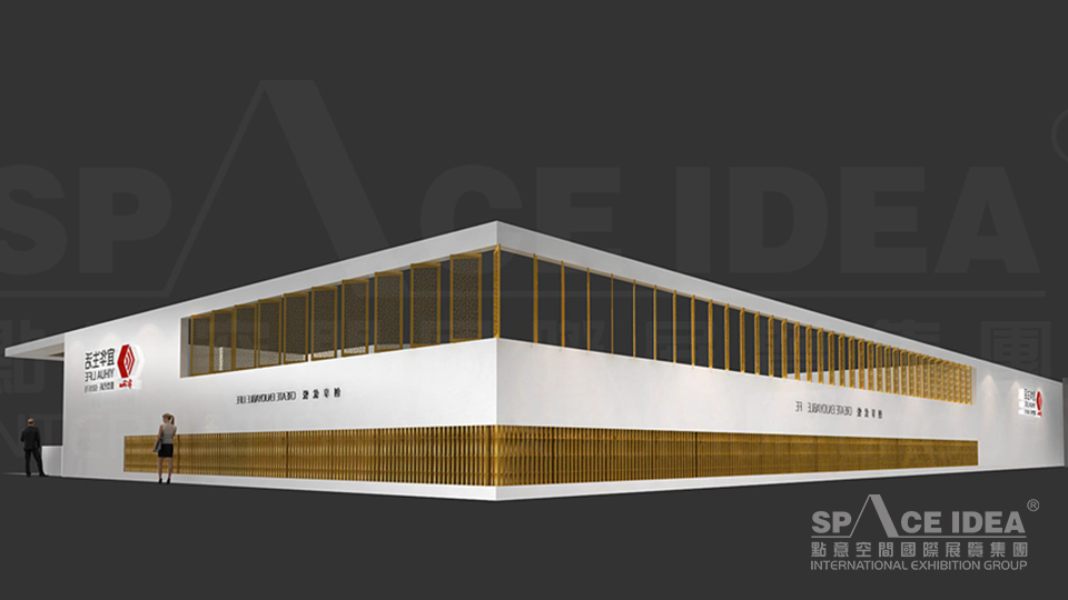 本案以白色及金黃為主基調,宜華生活LOGO圖形傳承輝煌歷史,以明亮的紅色傳達宜華生活從傳統制造業到互聯網住居生活服務業的跨越,詮釋一種擁抱生活,激情活力的姿態。倒立的LOGO可以激發觀眾的好奇心,又打破常規,不落窠臼。外墻提取中式傳統窗棱加以裝飾,給人一種古典雅致的感覺。展臺內墻壁上懸掛裝飾畫及綠植,與宜華家居的軟體家具、一體化櫥柜衣柜、智能家具及家具用品一起營造出一種宜家宜業的氛圍。