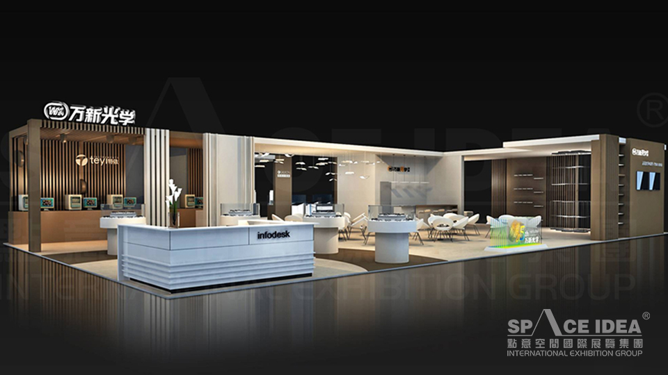 本案采用可塑性極強(qiáng)的淺色系材料,以暗金色和白色為主打,通過(guò)金屬質(zhì)感和板材的厚重,來(lái)體現(xiàn)萬(wàn)新光學(xué)國(guó)際眼鏡系列的經(jīng)典時(shí)尚,不張揚(yáng)卻極有內(nèi)涵與品位。整個(gè)展臺(tái)采用三面通透的結(jié)構(gòu)設(shè)計(jì),風(fēng)格簡(jiǎn)單明了,中性的設(shè)計(jì)風(fēng)格,充滿了現(xiàn)代時(shí)尚感。