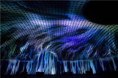 《VorticesofLightParticles》,以旋渦為主題,靈感源自光反射到瀑布的水流或巖石上的情景,在直徑30m、面積約500㎡的大空間里展現這一“自然風景”。